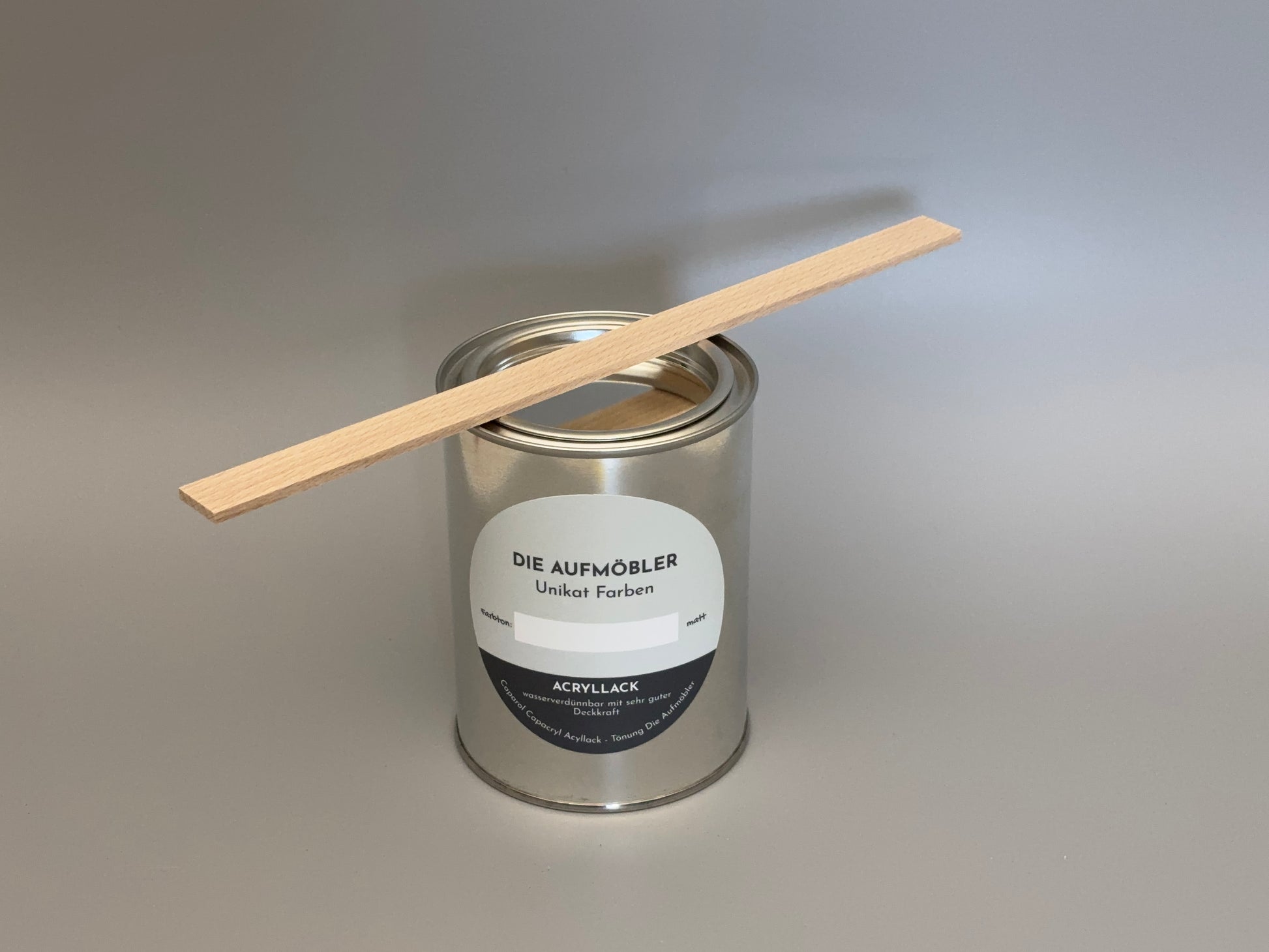 Die Lacke werden vor Gebrauch gut aufgerührt. Einen abgebrochenen Zollstock oder ein Restholz aus der Abfalltonne kann man natürlich auch benutzen, aber mit diesem feinen Stück Buchenholz ist es deutlich angenehmer. Größe: 260 x 16 x 3,2 mm