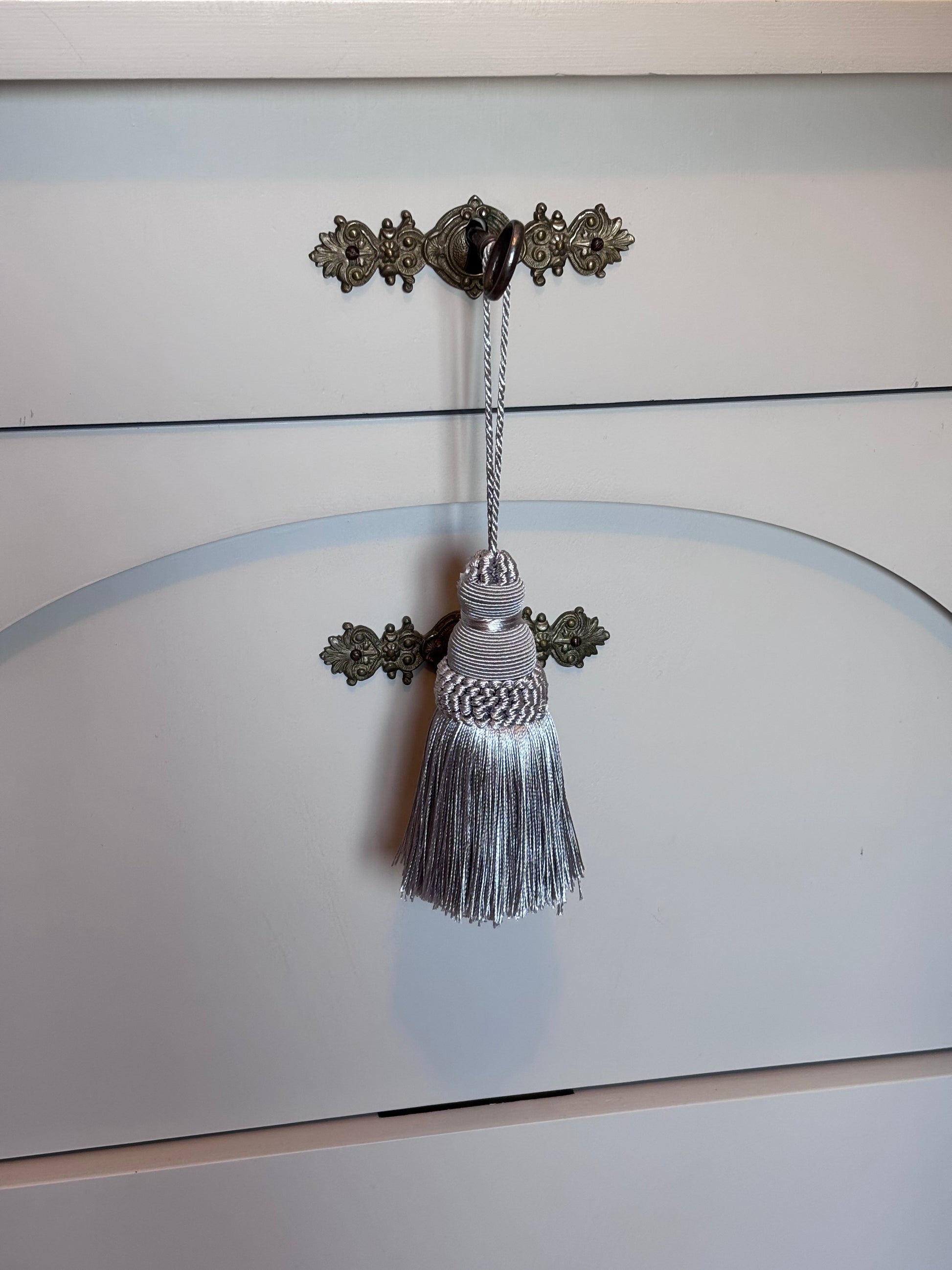 Stilvolles Accessoire für dein Möbel. Diese wunderschöne silber-graue Quaste hat eine Länge von ca. 23cm (mit Aufhängung) und einem Durchmesser von ca. 3,5cm.